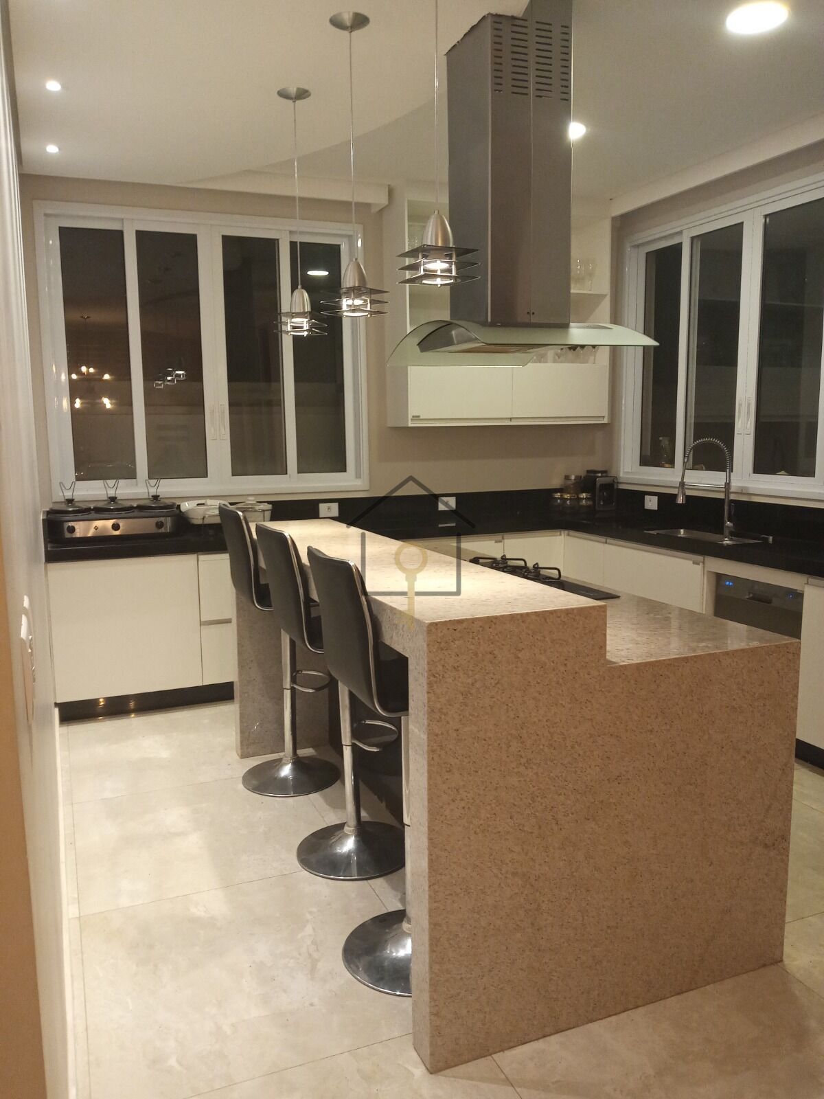 - Cozinha em conceito aberto com armários planejados, coifa e cooktop